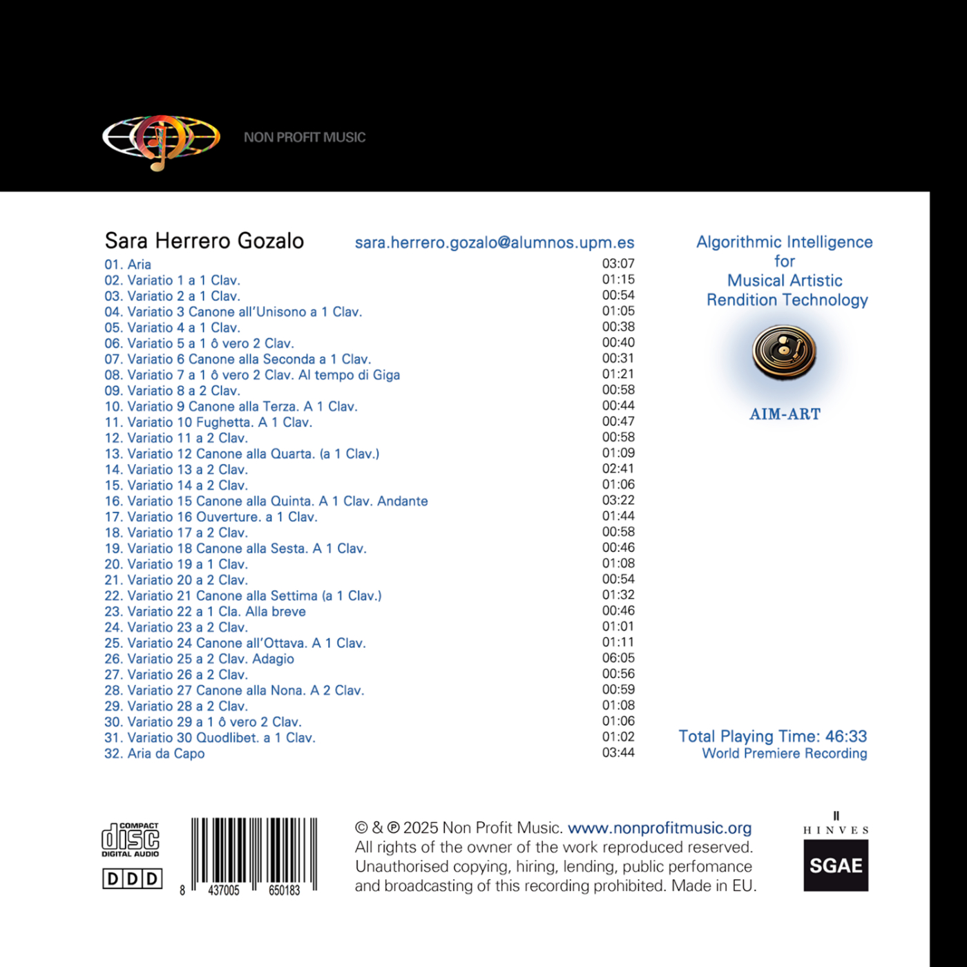 • World Premiere Artistic Recording of the Goldberg Variations without human performance. • For the first time ever, a musical album has been brought to life using AIM-ART: Algorithmic Intelligence for Musical Artistic Rendition Technology.