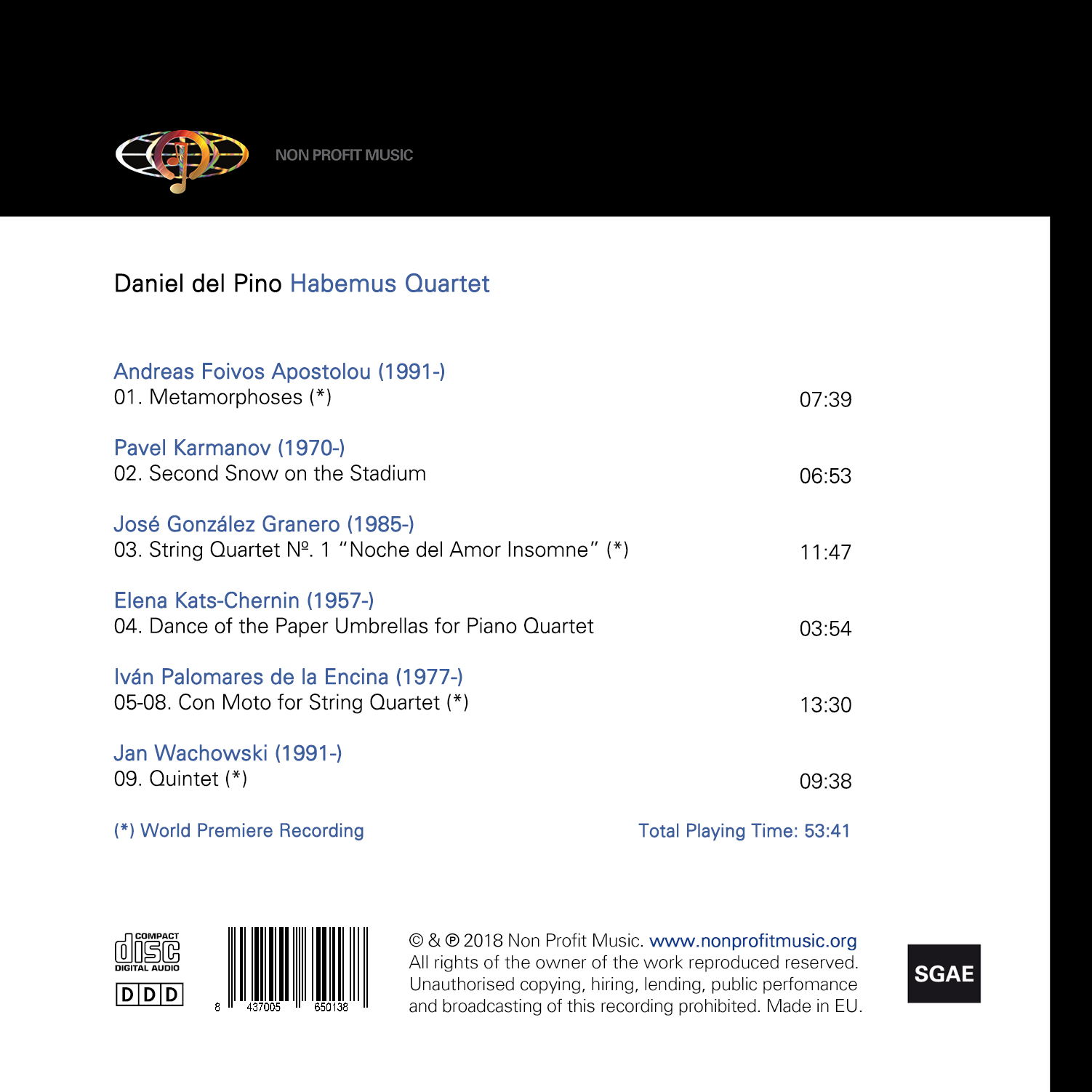 COMPOSER Andreas Foivos Apostolou · Pavel Karmanov · José González Granero · Elena Kats-Chernin · Iván Palomares de la Encina · Jan Wachowski ARTIST Daniel del Pino · Habemus Quartet